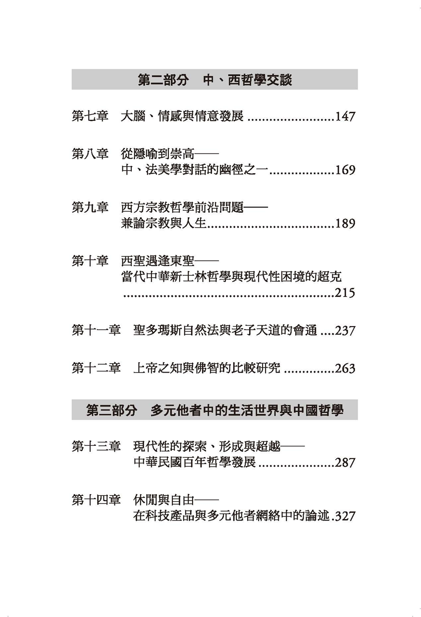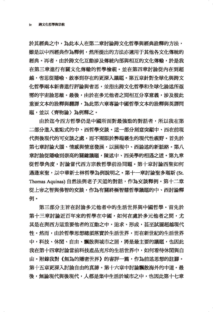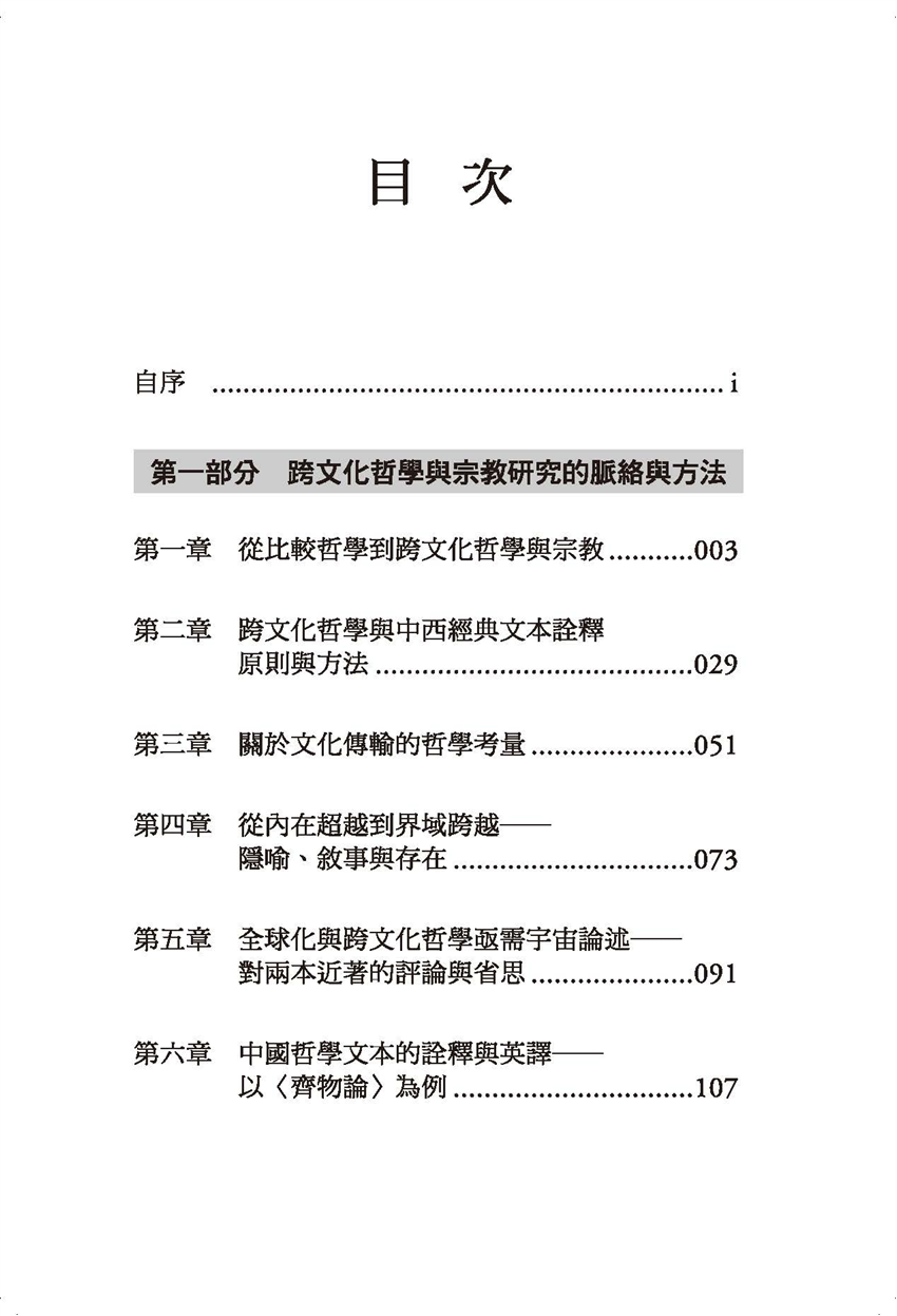 第一部分 跨文化哲學與宗教研究的脈絡與方法 第一章 從比較哲學到跨文化哲學與宗教 第二章 跨文化哲學與中西經典文本詮釋原則與方法 第三章 關於文化傳輸的哲學考量 第四章 從內在超越到界域跨越─隱喻、敘事與存在 第五章 全球化與跨文化哲學亟需宇宙論述─對兩本近著的評論與省思 第六章 中國哲學文本的詮釋與英譯─以〈齊物論〉為例 第二部分 中、西哲學交談 第七章 大腦、 第八章 從隱喻到崇高─中、法美學對話的幽徑之一 第九章 西方宗教哲學前沿問題─兼論宗教與人生 第十章 西聖遇逢東聖─當代中華新士林哲學與現代性困境的超克 第十一章 聖多瑪斯自然法與老子天道的會通 第十二章 上帝之知與佛智的比較研究 第三部分 多元他者中的生活世界與中國哲學 第十三章 現代性的探索、形成與超越─中華民國百年哲學發展 第十四章 休閒與自由:在科技產品與多元他者網絡中的論述 第十五章 自由的真諦 第十六章 從靈根自植到和諧外推 第十七章 城市之道─融合現象學與中國哲學的省思 中文人名索引 外文人名譯名索引 |