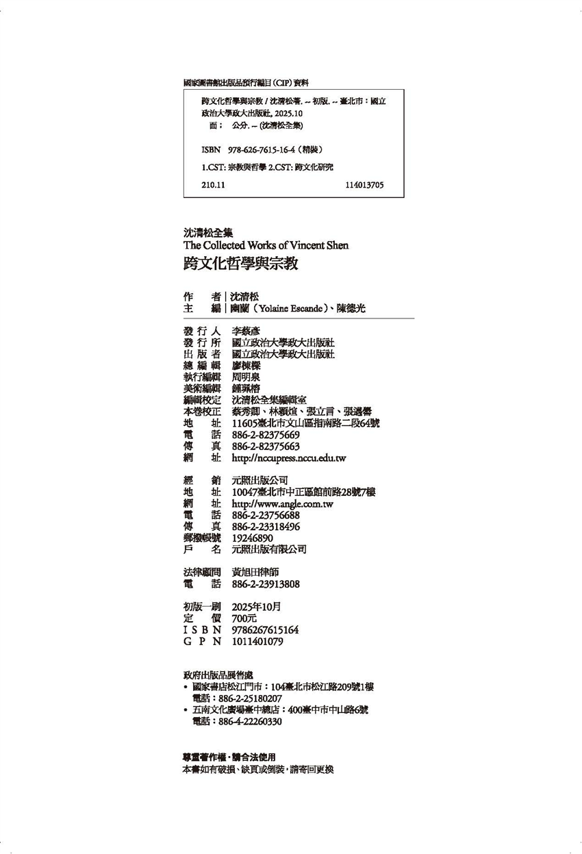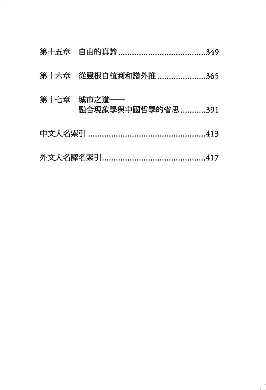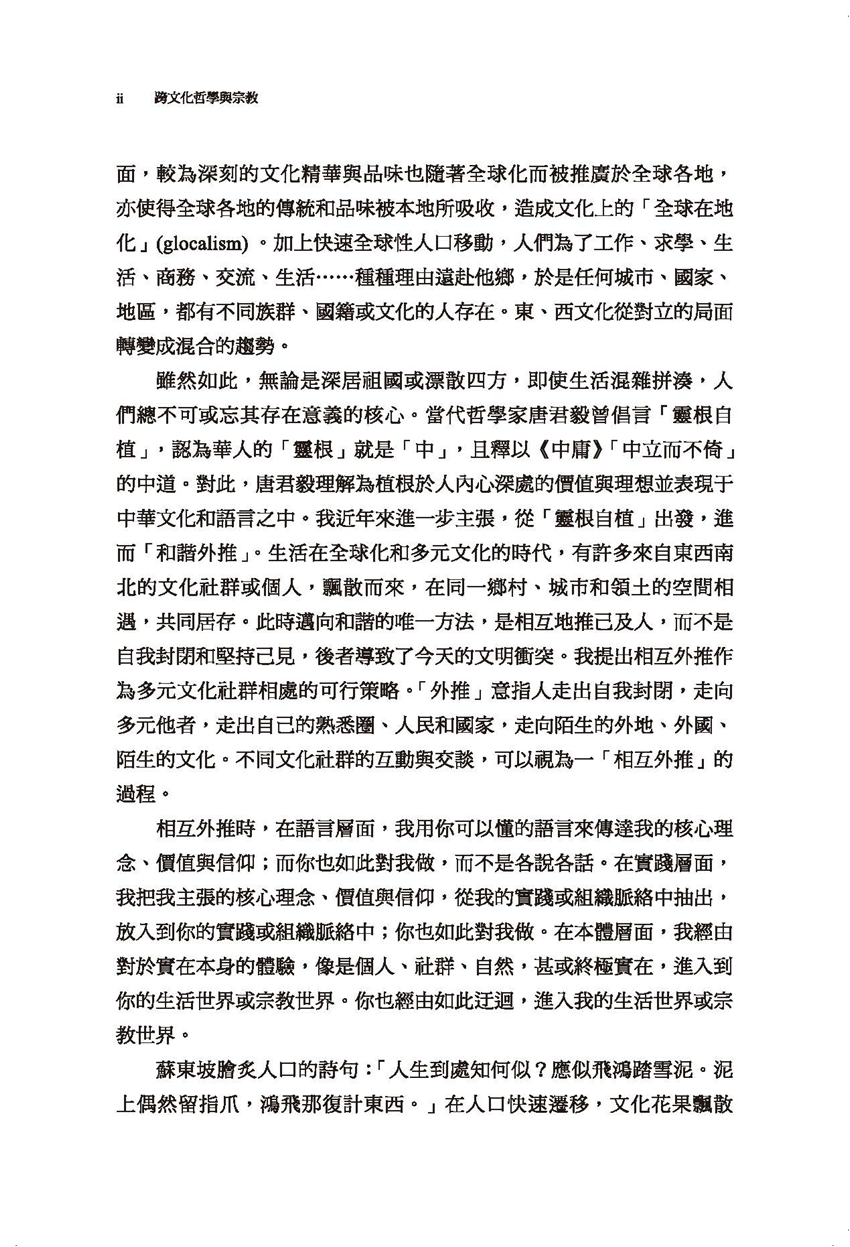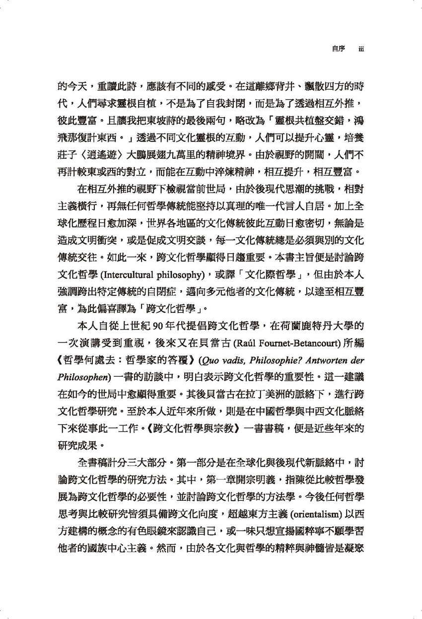 第一部分 跨文化哲學與宗教研究的脈絡與方法 第一章 從比較哲學到跨文化哲學與宗教 第二章 跨文化哲學與中西經典文本詮釋原則與方法 第三章 關於文化傳輸的哲學考量 第四章 從內在超越到界域跨越─隱喻、敘事與存在 第五章 全球化與跨文化哲學亟需宇宙論述─對兩本近著的評論與省思 第六章 中國哲學文本的詮釋與英譯─以〈齊物論〉為例 第二部分 中、西哲學交談 第七章 大腦、 第八章 從隱喻到崇高─中、法美學對話的幽徑之一 第九章 西方宗教哲學前沿問題─兼論宗教與人生 第十章 西聖遇逢東聖─當代中華新士林哲學與現代性困境的超克 第十一章 聖多瑪斯自然法與老子天道的會通 第十二章 上帝之知與佛智的比較研究 第三部分 多元他者中的生活世界與中國哲學 第十三章 現代性的探索、形成與超越─中華民國百年哲學發展 第十四章 休閒與自由:在科技產品與多元他者網絡中的論述 第十五章 自由的真諦 第十六章 從靈根自植到和諧外推 第十七章 城市之道─融合現象學與中國哲學的省思 中文人名索引 外文人名譯名索引 |