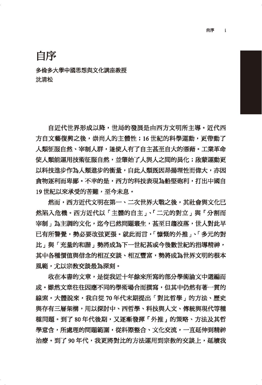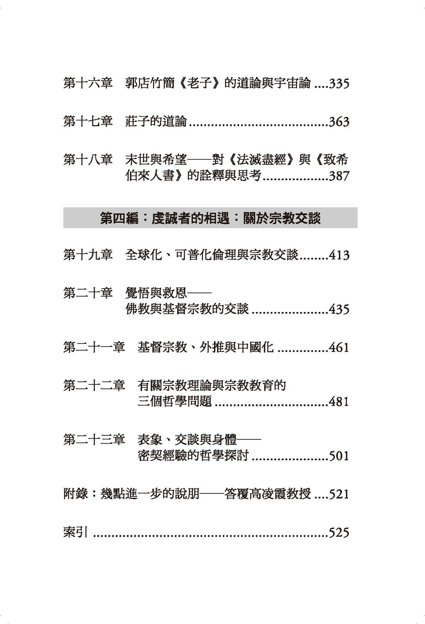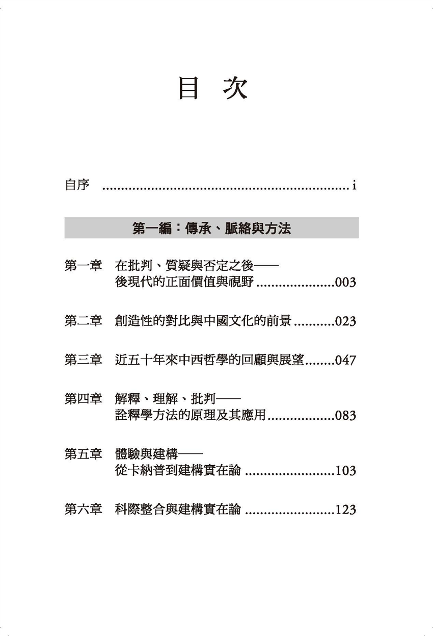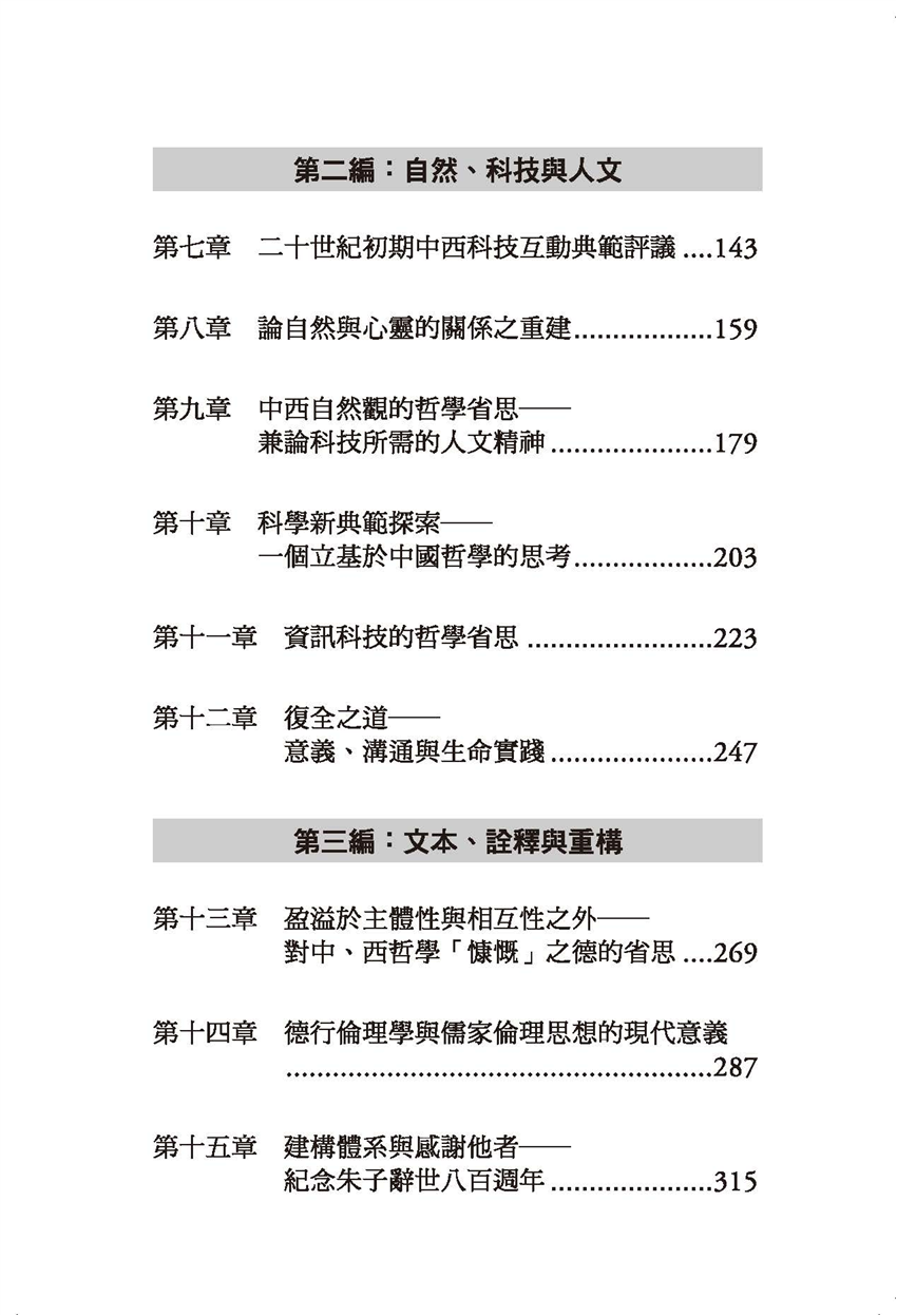 第一編:傳承、脈絡與方法 第一章 在批判、質疑與否定之後─後現代的正面價值與視野 第二章 創造性的對比與中國文化的前景 第三章 近五十年來中西哲學的回顧與展望 第四章 解釋、理解、批判─詮釋學方法的原理及其應用 第五章 體驗與建構─從卡納普到建構實在論 第六章 科際整合與建構實在論 第二編:自然、科技與人文 第七章 二十世紀初期中西科技互動典範評議 第八章 論自然與心靈的關係之重建 第九章 中西自然觀的哲學省思─兼論科技所需的人文精神 第十章 科學新典範探索─一個立基於中國哲學的思考 第十一章 資訊科技的哲學省思 第十二章 復全之道─意義、溝通與生命實踐 第三編:文本、詮釋與重構 第十三章 盈溢於主體性與相互性之外─對中、西哲學「慷慨」之德的省思 第十四章 德行倫理學與儒家倫理思想的現代意義 第十五章 建構體系與感謝他者─紀念朱子辭世八百週年 第十六章 郭店竹簡《老子》的道論與宇宙論 第十七章 莊子的道論 第十八章 末世與希望─對〈法滅盡經〉與〈致希伯來人書〉的詮釋與思考 第四編:虔誠者的相遇:關於宗教交談 第十九章 全球化、可普化倫理與宗教交談 第二十章 覺悟與救恩─佛教與基督宗教的交談 第二十一章 基督宗教、外推與中國化 第二十二章 有關宗教理論與宗教教育的三個哲學問題 第二十三章 表象、交談與身體─密契經驗的哲學探討 附錄:幾點進一步的說朋─答覆高凌霞教授 索引 |