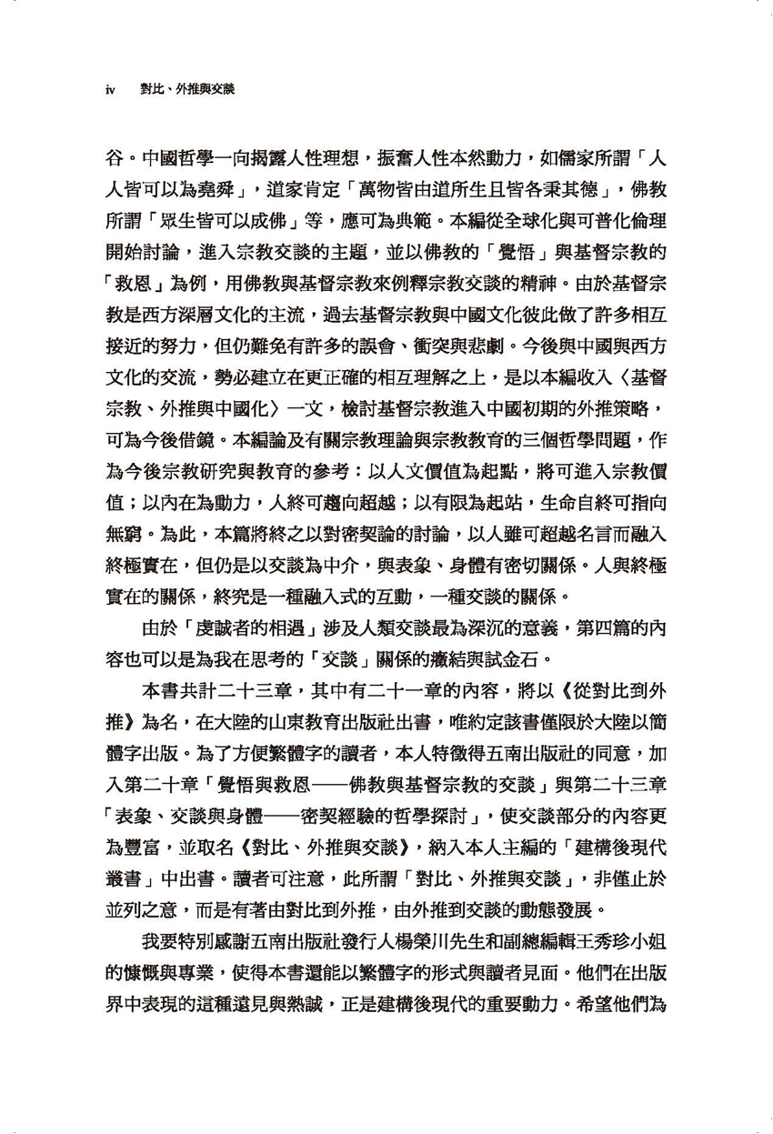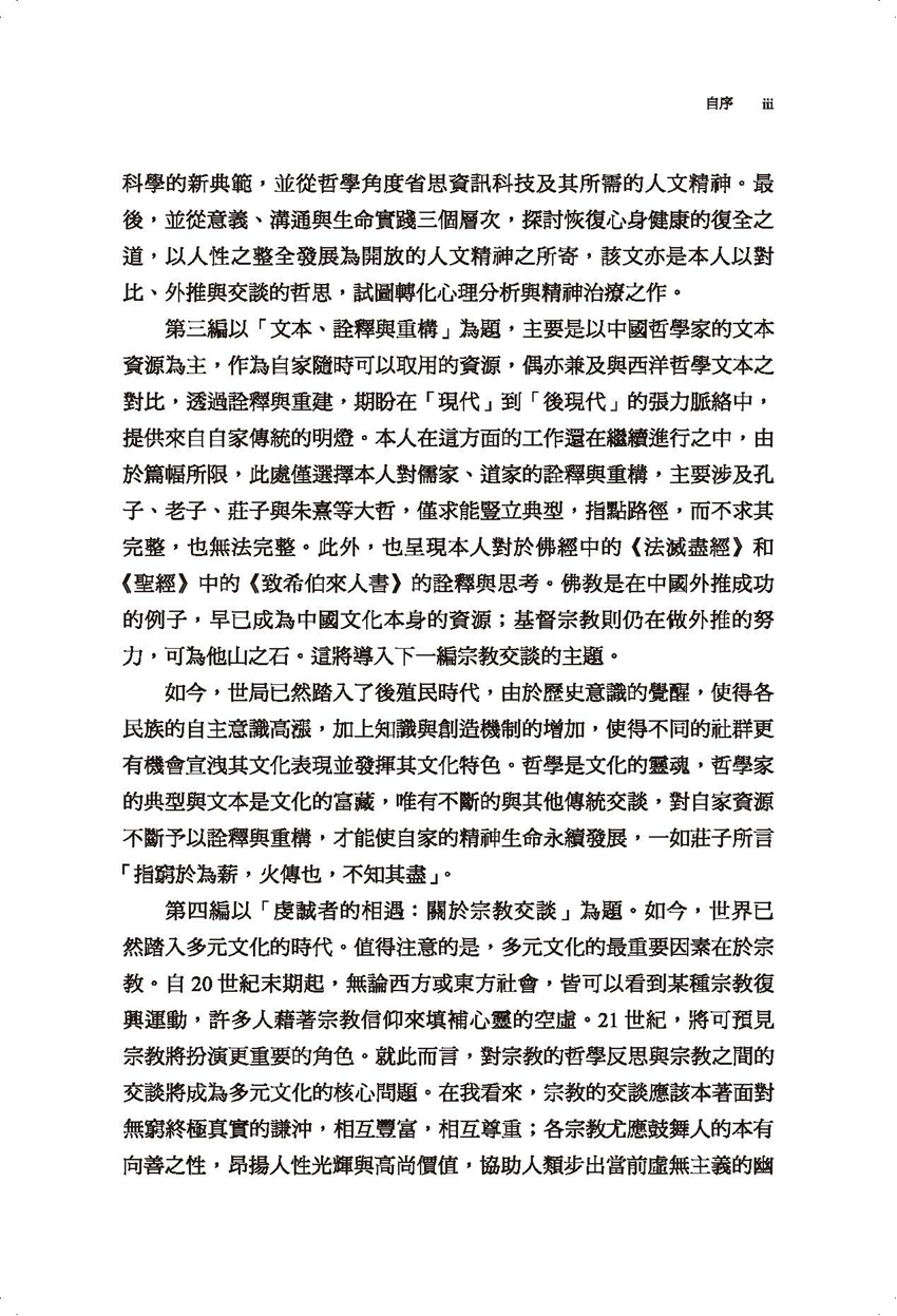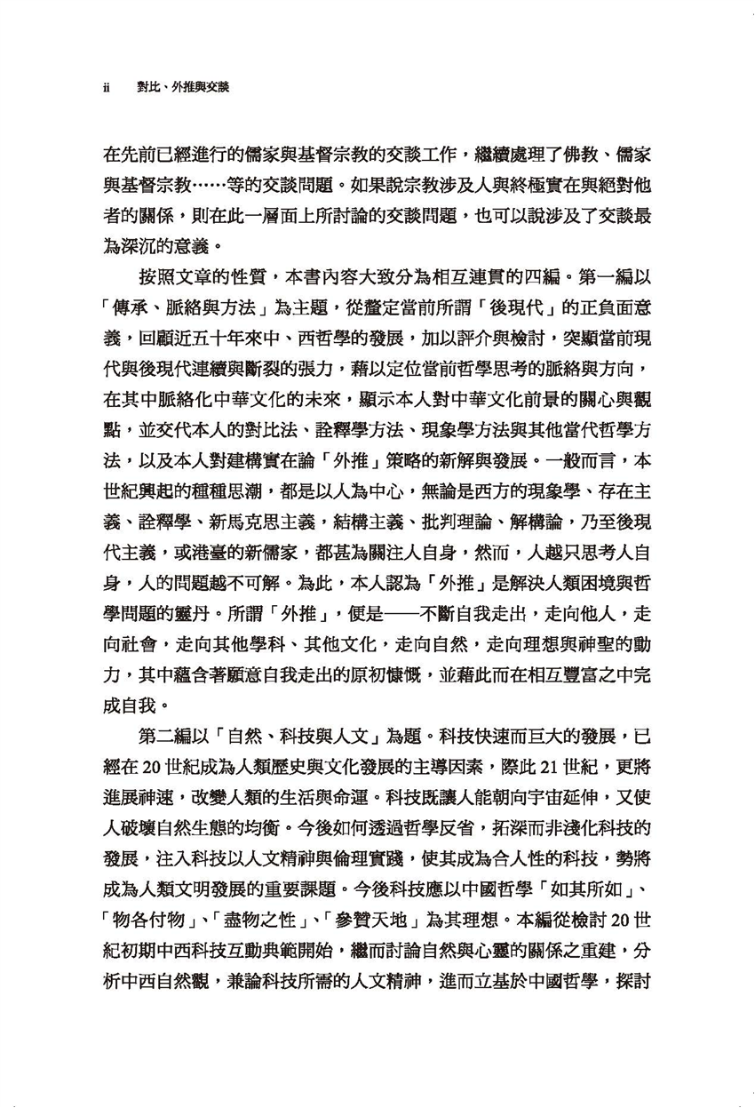 我自從七十年代末期提出「對比哲學」的方法、歷史與存有三層架構,用以探討中、西哲學、科技與人文、傳統與現代等種種問題。到了八十年代後期,又逐漸發揮「外推」的策略、方法及其哲學意含,所處理的問題範圍,從科際整合、文化交流,一直延伸到精神治療。到了九十年代,我更將對比的方法運用到宗教的交談上,延續我在先前已經進行的儒家與基督宗教的交談工作,繼續處理了佛教、儒家與基督宗教等的交談問題。
