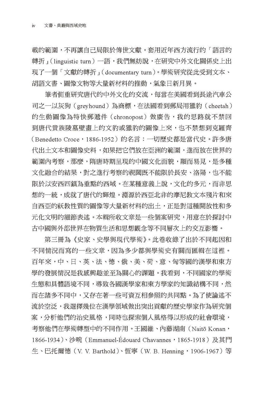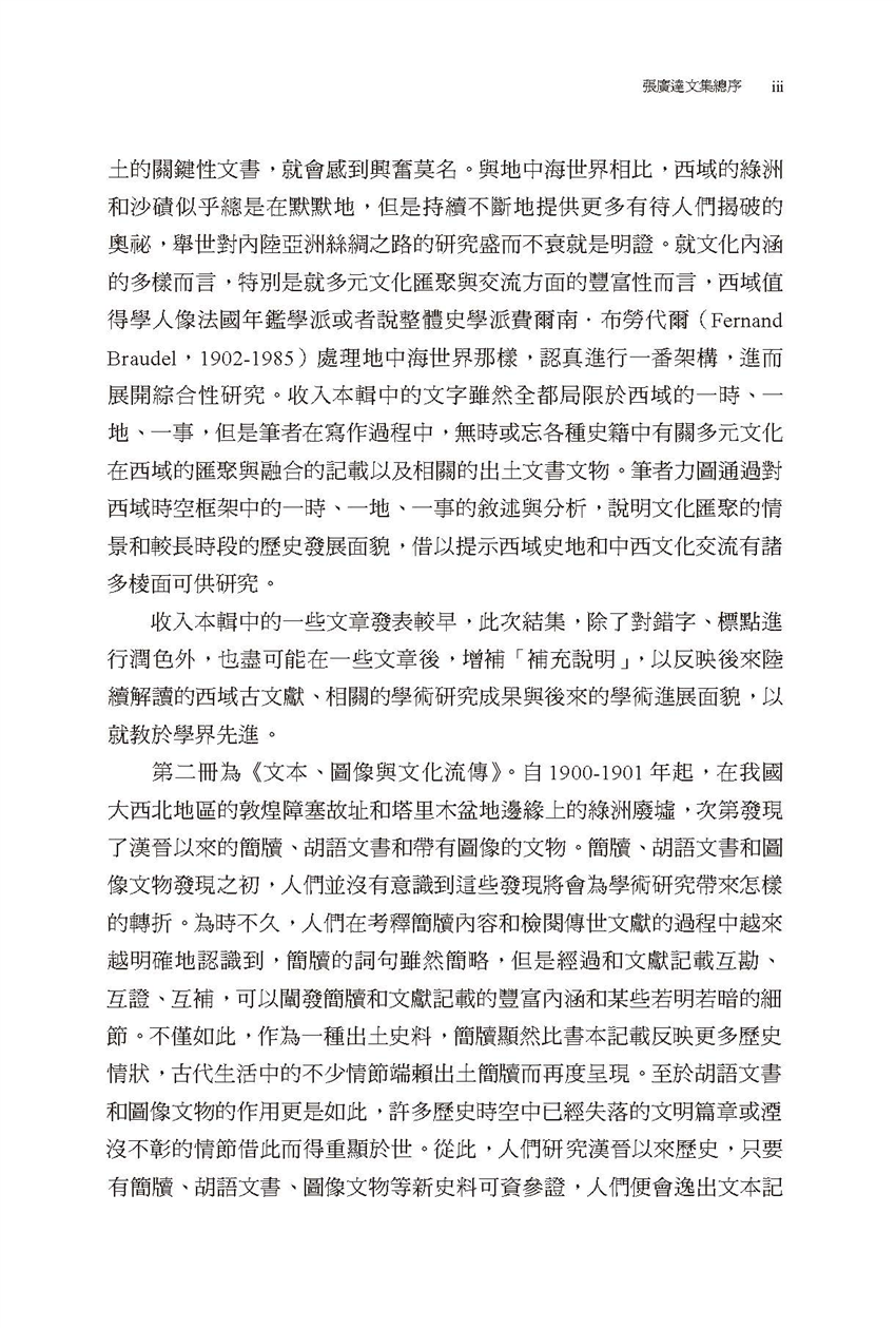 多年以來,我一直感到,西域研究和地中海世界研究一樣,具莫大魅力。每當學人解破一件西域出土的關鍵性文書,就會感到興奮莫名。與地中海世界相比,西域的綠洲和沙磧似乎總是在默默地,但是持續不斷地提供更多有待人們揭破的奧祕,舉世對內陸亞洲絲綢之路的研究盛而不衰就是明證。就文化內涵的多樣而言,特別是就多元文化匯聚與交流方面的豐富性而言,西域值得學人像法國年鑑學派或者說整體史學派費爾南.布勞代爾(Fernand Braudel,1902-1985)處理地中海世界那樣,認真進行一番架構,進而展開綜合性研究。收入本輯中的文字雖然全都局限於西域的一時、一地、一事,但是筆者在寫作過程中,無時或忘各種史籍中有關多元文化在西域的匯聚與融合的記載以及相關的出土文書文物。筆者力圖通過對西域時空框架中的一時、一地、一事的敘述與分析,說明文化匯聚的情景和較長時段的歷史發展面貌,借以提示西域史地和中西文化交流有諸多棱面可供研究。